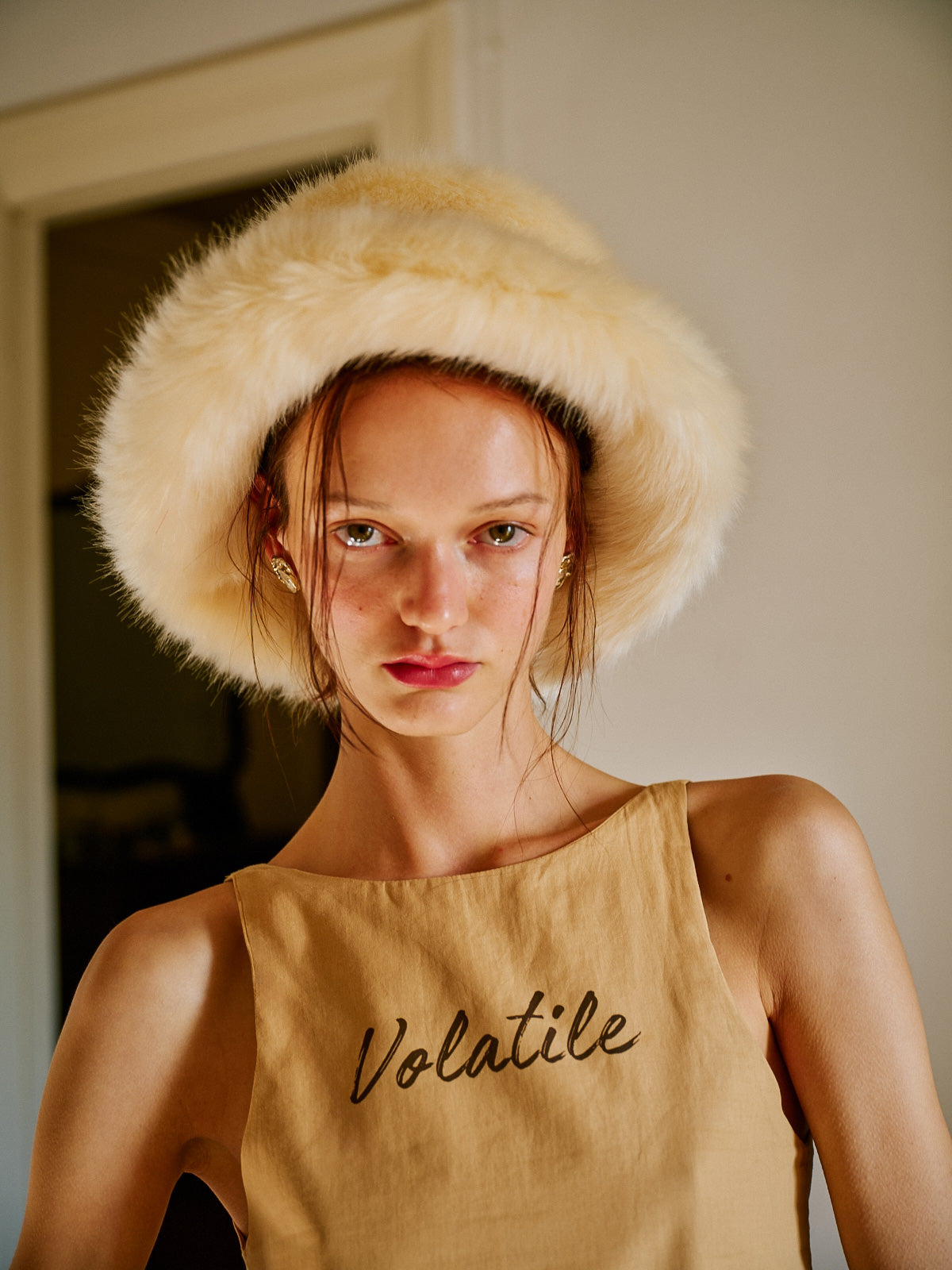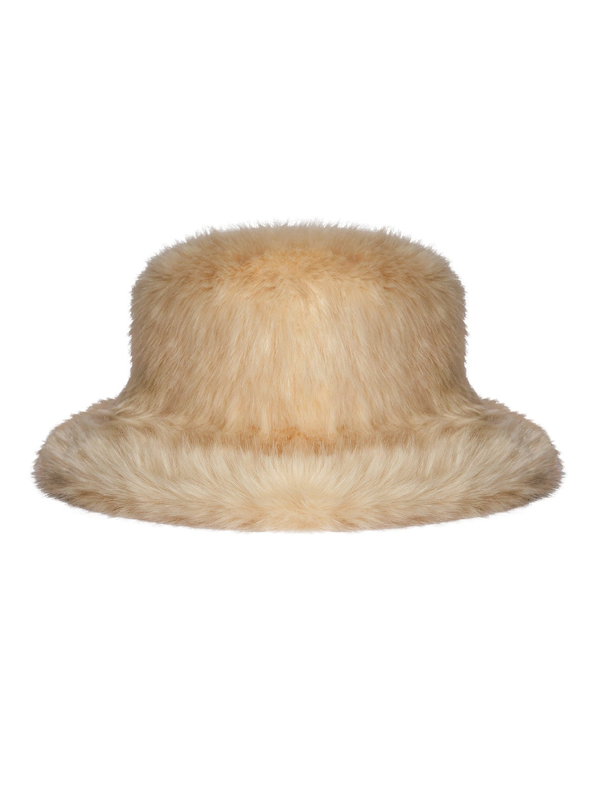 Yumuşak dokulu, bej-sarı arası tonlarda WAYT Studio'nun sanatsal aksesuar koleksiyonundan Polunin suni kürk şapka – dekupe ürün görseli.
